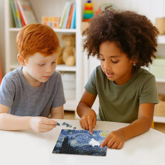 Apropie prietenii sau familia în timp ce construiești o scenă frumoasă. Fiecare piesă mică se potrivește perfect și creează artă uimitoare pentru toți. Bucură-te de momente relaxante în timp ce îți dezvolți abilitățile de rezolvare a problemelor și răbdarea. Puzzle-ul Kidzly cu pictură în ulei oferă distracție încântătoare atât pentru copii, cât și pentru adulți.