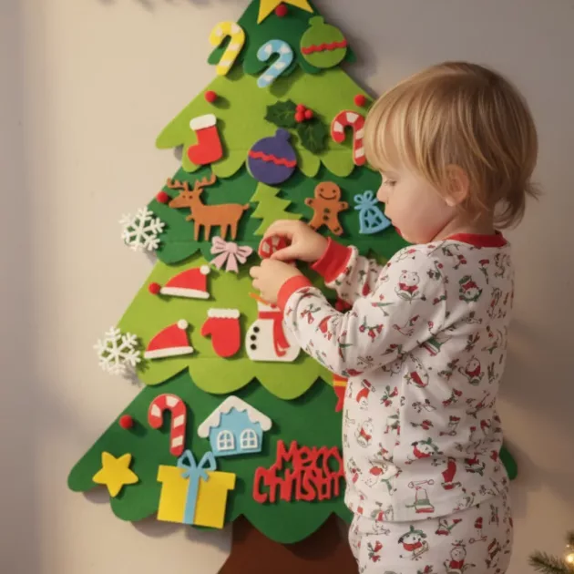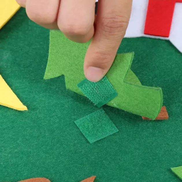 Copiii mei nu se mai satură de acest brad din fetru. Rearanjează formele drăguțe în fiecare dimineață, iar curățenia este atât de ușoară. Râdem atât de mult împreună.