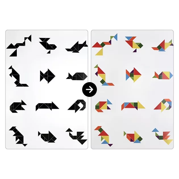 Acest joc tangram ne ține ocupați pe mine și pe fratele meu ore întregi! Ne place să combinăm formele ca să facem animale haioase și puzzle-uri tari. Este super distractiv.