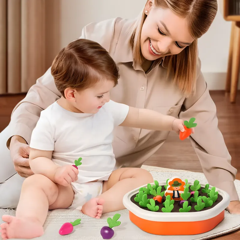 Grădina cu morcovi e ușor de instalat. Copilului meu îi place să sorteze fiecare piesă și nu se plictisește după câteva minute.