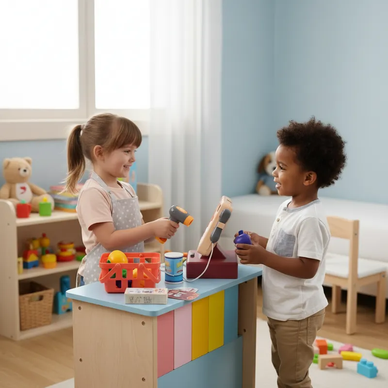 Distracție grozavă după școală! Prietenii mei vin la mine și ne jucăm cu toții de-a magazinul. Zgomotul scannerului îl face să pară real, și numărăm monedele împreună.