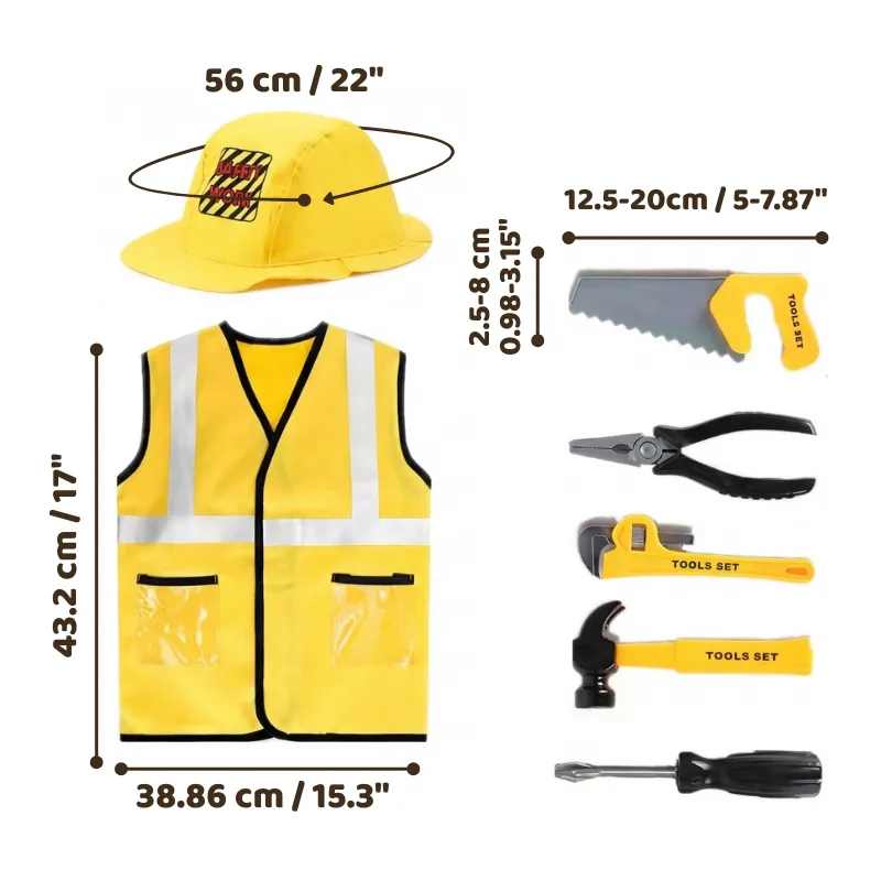 L-am cumpărat pentru zile ploioase și a fost un succes. Uneltele sunt ușoare, vesta se potrivește bine, iar treburile imaginare îi țin pe toți distrați.