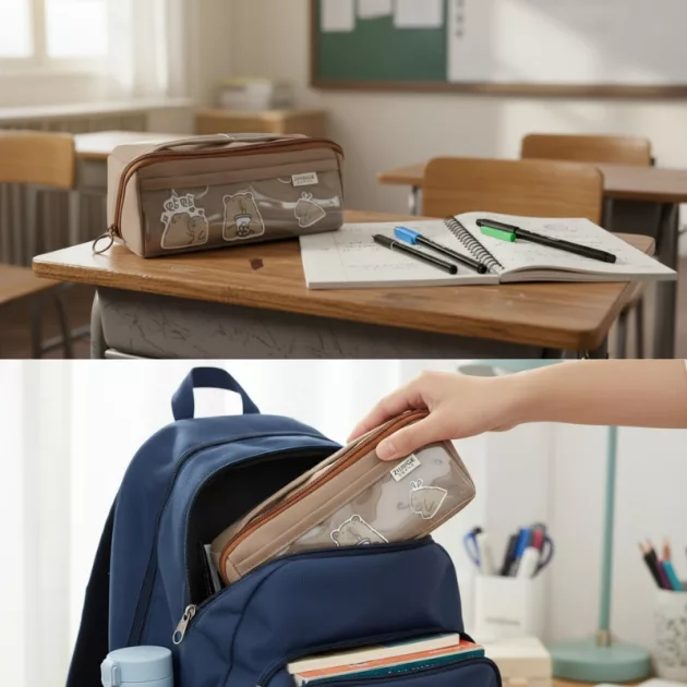 Nu mai trebuie să-mi fac griji că pierd radiere! Țin notițele mici și insigna în partea transparentă, iar penarul e moale la atingere.