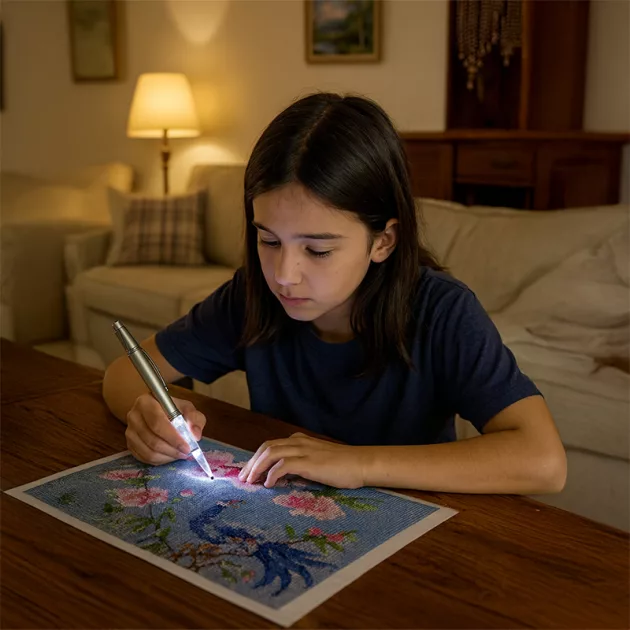 Cu pixul care luminează, este mult mai ușor să vezi unde merge fiecare diamant. Fiica mea și-a terminat arta mai repede și s-a concentrat mai mult timp.