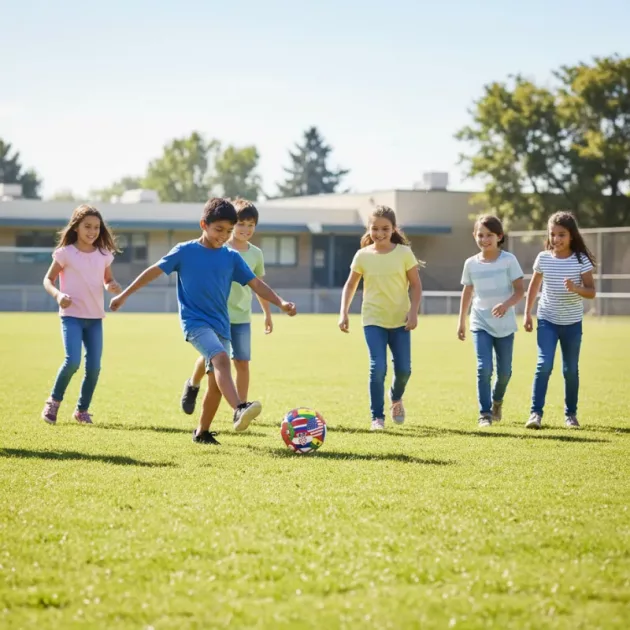 Conduc un mic club după școală, iar mingea asta a devenit rapid favorita. Copiii se împart în echipe după steaguri și exersează pasele în timp ce învață geografie.