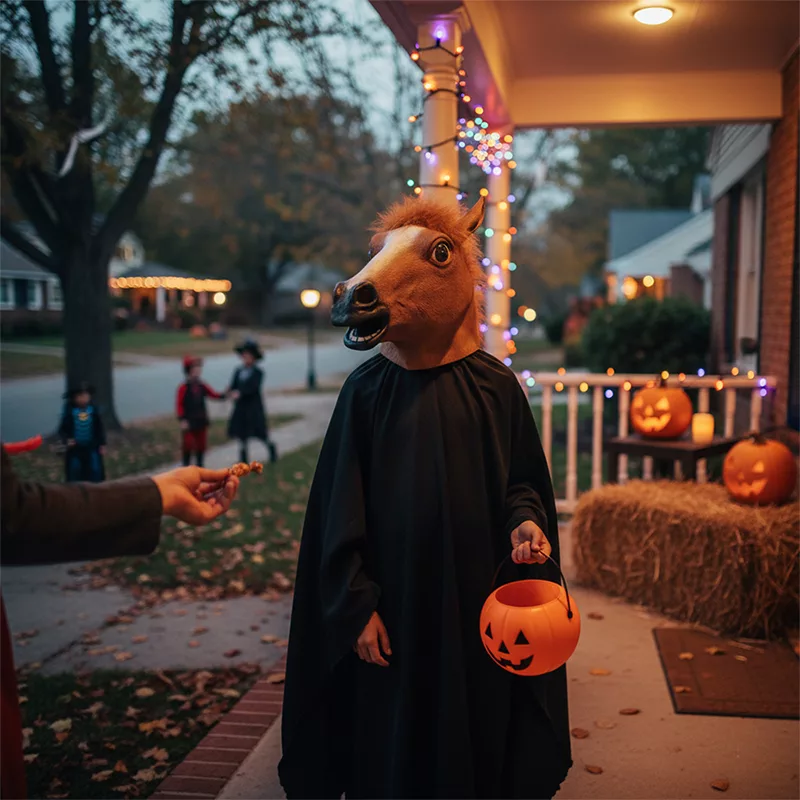 Copiilor le place să se costumeze și să își folosească imaginația. Designul unic de cap de cal aduce râsete la fiecare eveniment. Ușor de purtat, această mască este comodă și ușoară. Materialul rezistent din vinil asigură siguranța în timpul jocului.