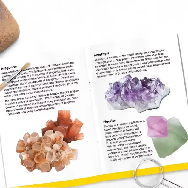Ghid Educațional - Un booklet colorat explică originea fiecărui specimen strălucitor. Copiii identifică fiecare descoperire, extinzându-și cu ușurință înțelegerea științifică.
