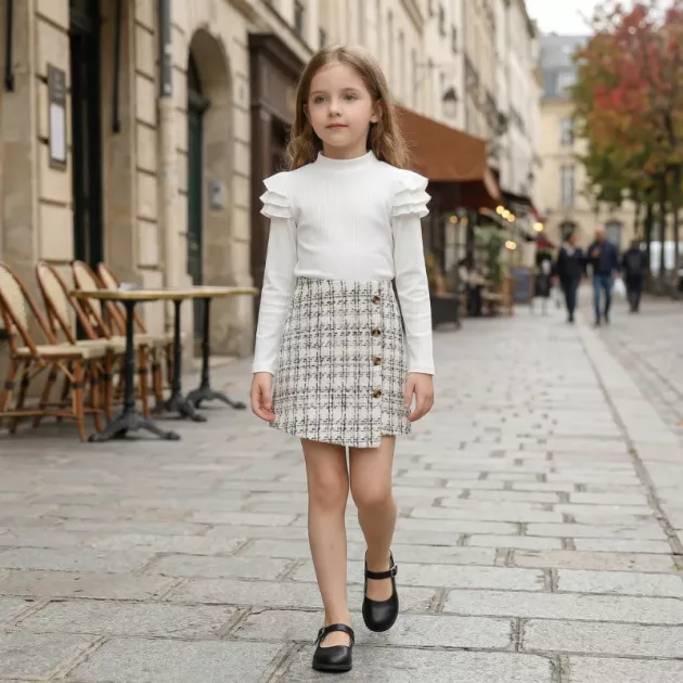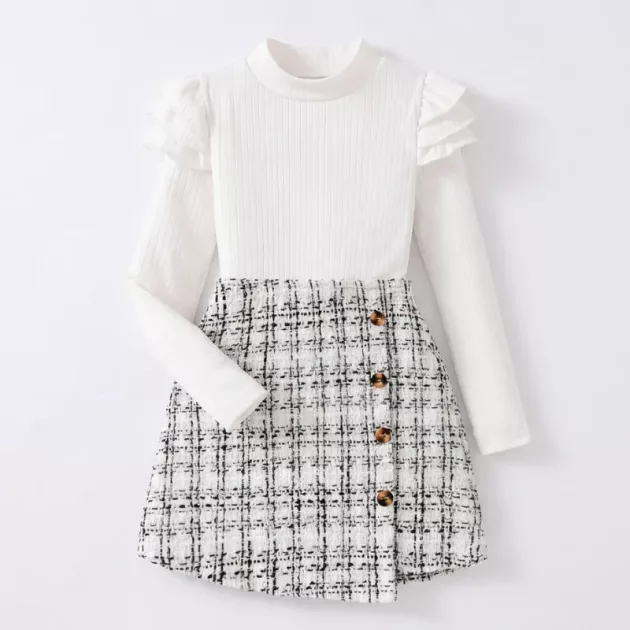 Fusta în carouri are un aspect clasic pe care îl ador, iar culoarea rezistă la spălat. Copilul meu se mișcă liber în acest set confortabil.