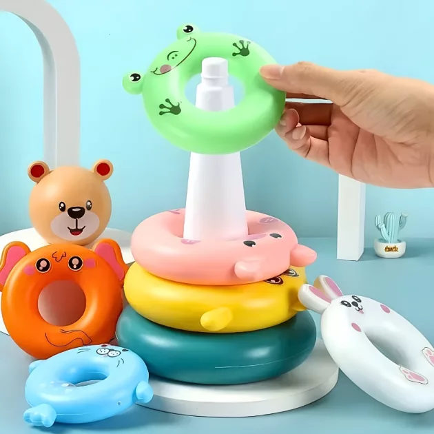 Copilul meu mic adoră să stivuiască aceste piese colorate. Învață despre animale în timp ce își îmbunătățește coordonarea. O activitate de joacă absolut genială!