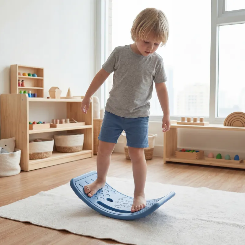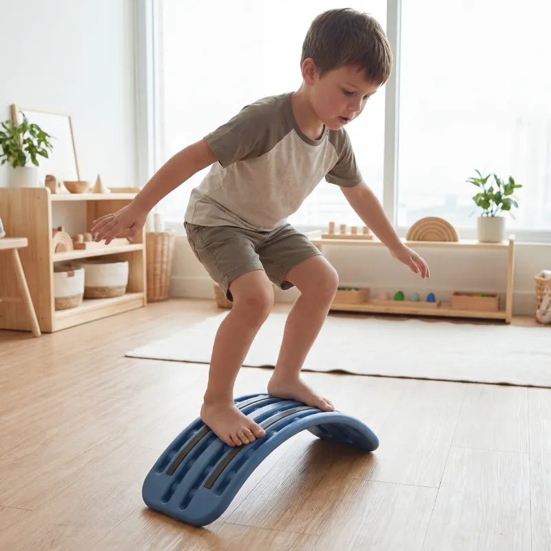 Sunt educatoare la grădiniță și am adus această placă curbă în clasă. Copiii fac cu rândul să meargă pe ea ca pe un pod și îi ajută mult la coordonare și încredere.
