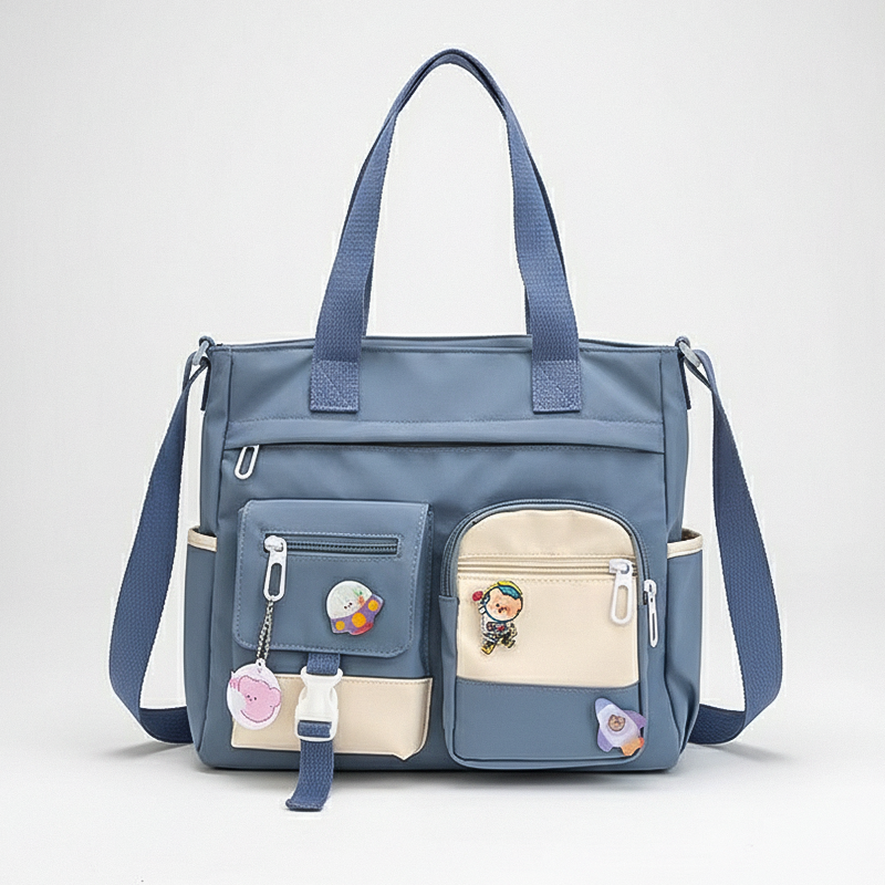 Această geantă crossbody e foarte tare. Buzunarele mă ajută să găsesc ușor jucăriile și cureaua nu mă doare deloc la umăr.