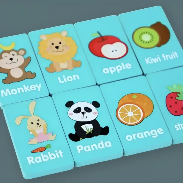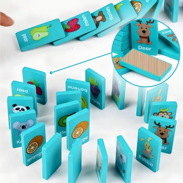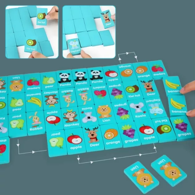 Design colorat - Fiecare piesă domino prezintă ilustrații vii cu animale sau fructe. Aceste desene amuzante vor capta atenția copiilor și le vor stimula creativitatea.