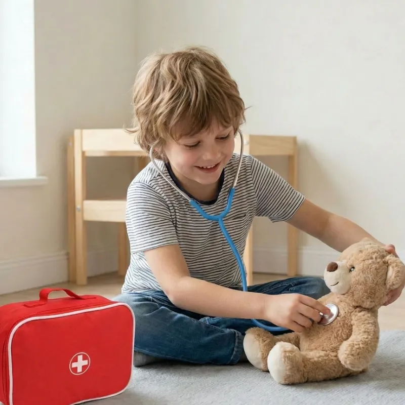Am luat acest set de doctor din lemn pentru fetița mea de 4 ani, iar acum verifică cu blândețe bătăile inimii tuturor. A ajutat-o să fie mai puțin speriată de controalele medicale reale.